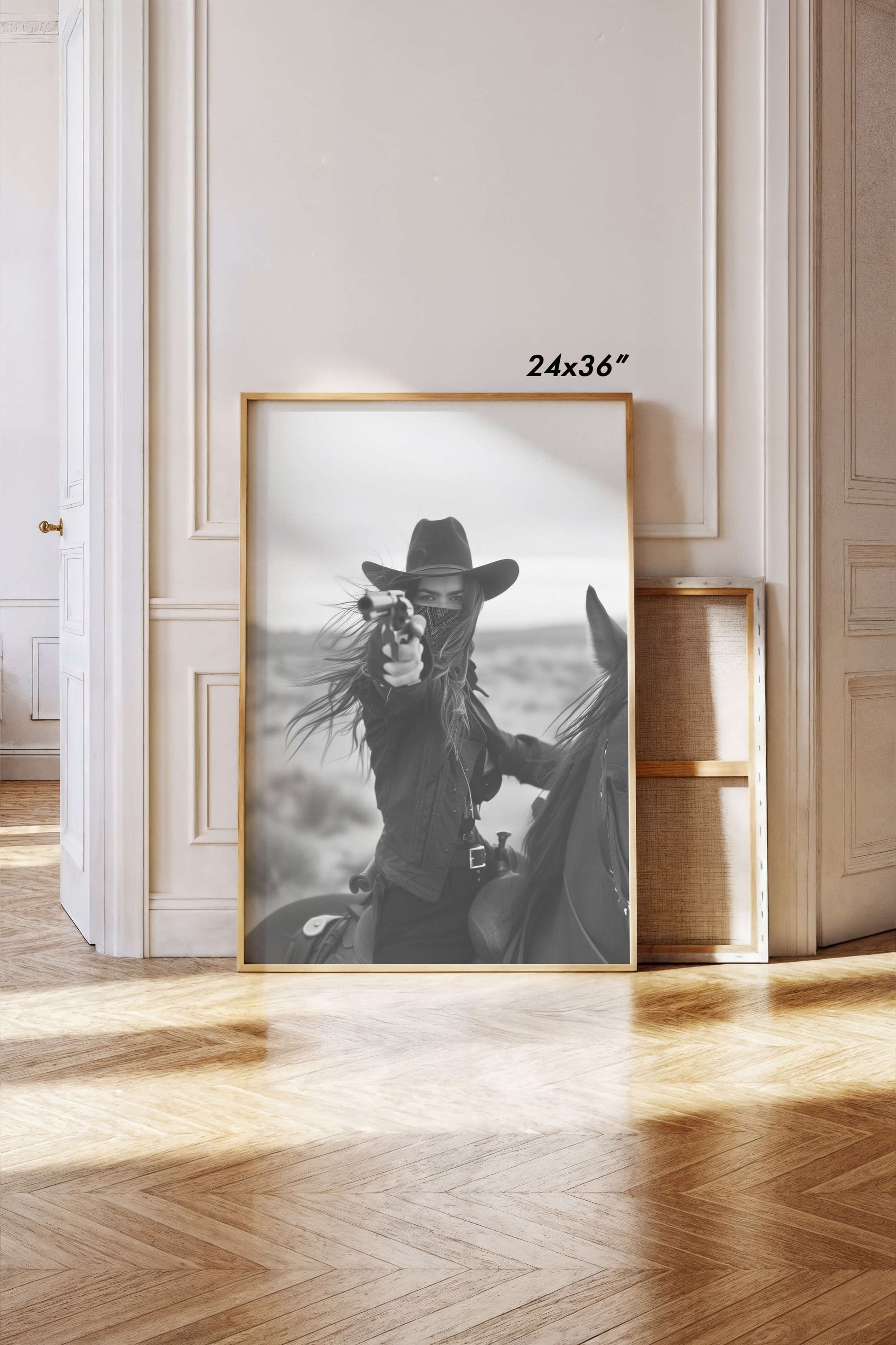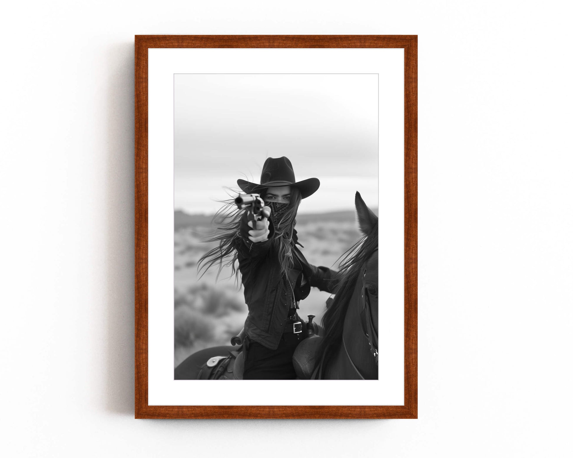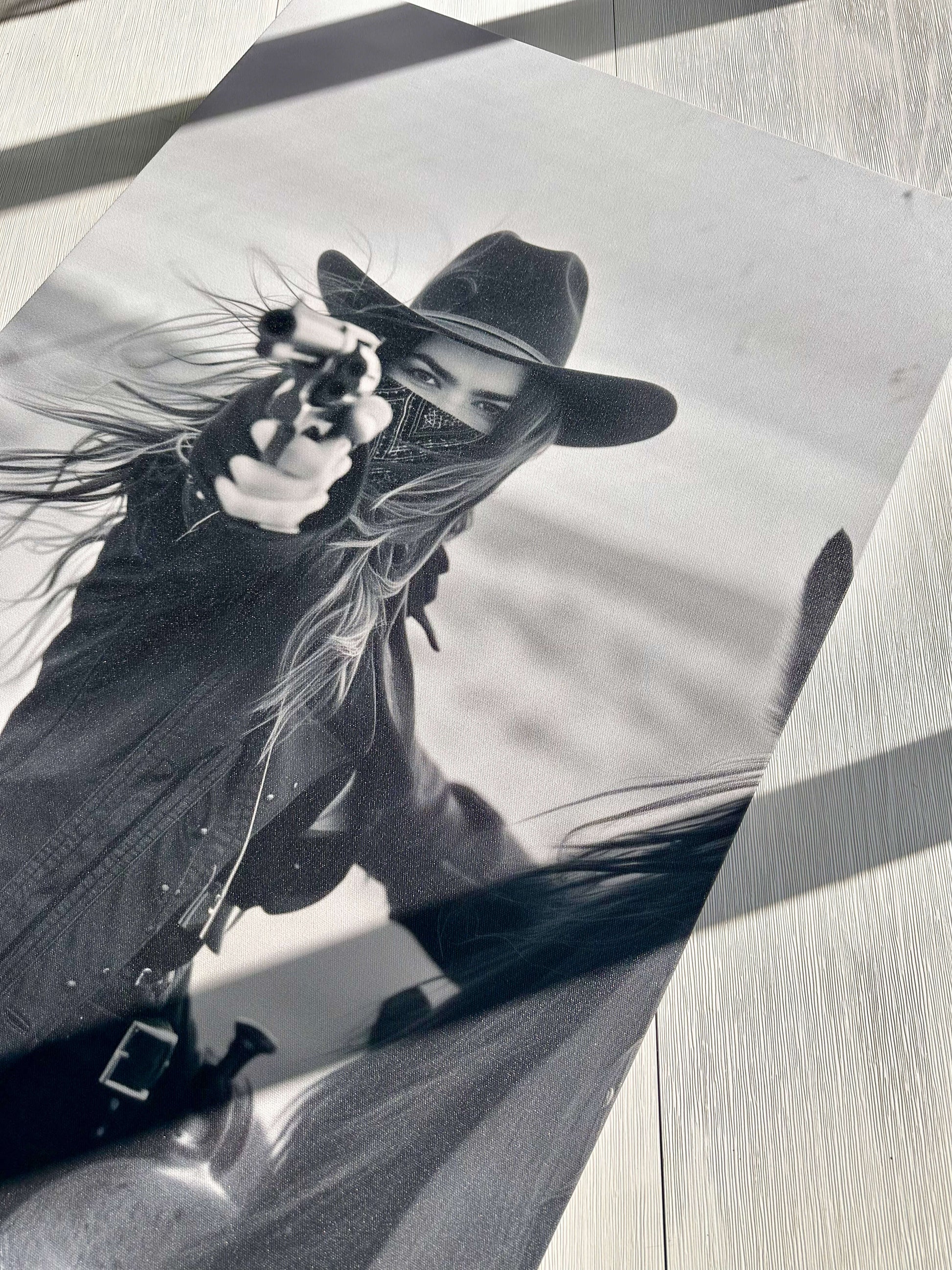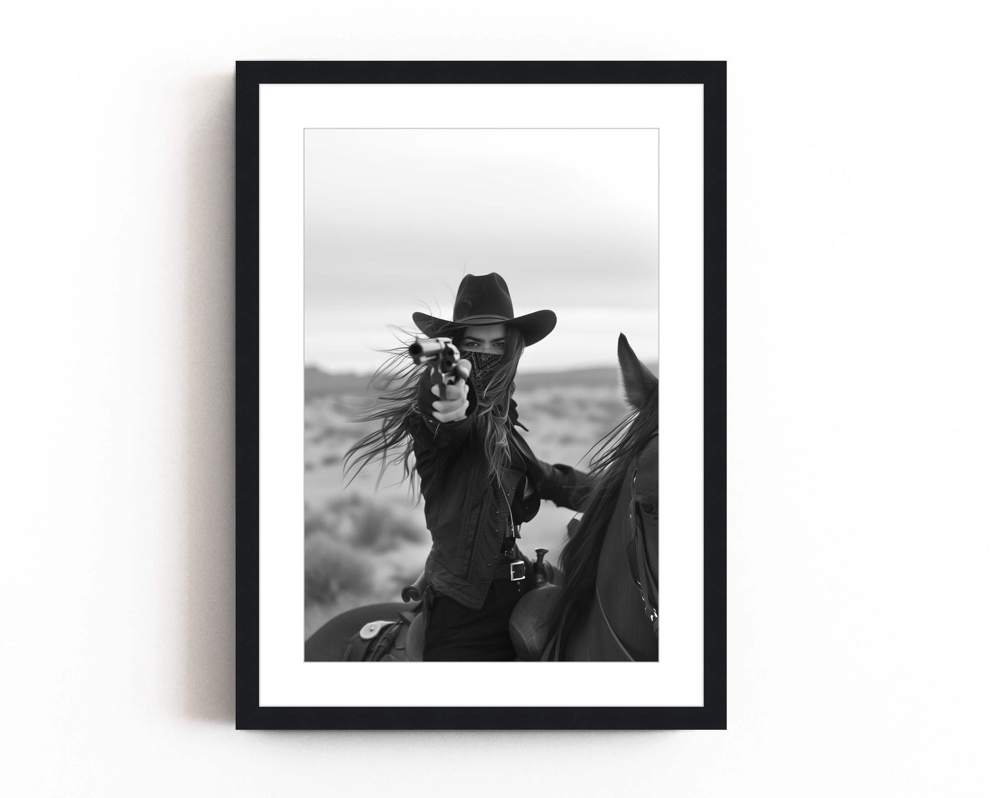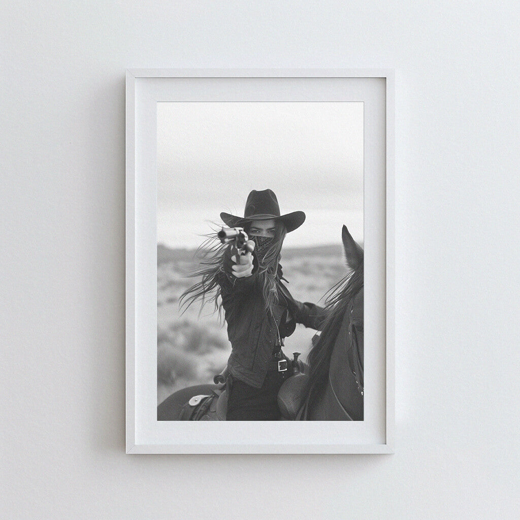 Capture the wild spirit of the Old West with this striking black and white photograph of a fearless rider on horseback, aiming her revolver against the backdrop of a desolate desert. This powerful image evokes a sense of adventure and raw determination, perfect for adding a bold statement to your living space, office, or gallery wall. Ideal for lovers of Western art and vintage photography, this print is available in various sizes and ready to frame. Bring a piece of the Wild West into your home with this captivating cowgirl art print.