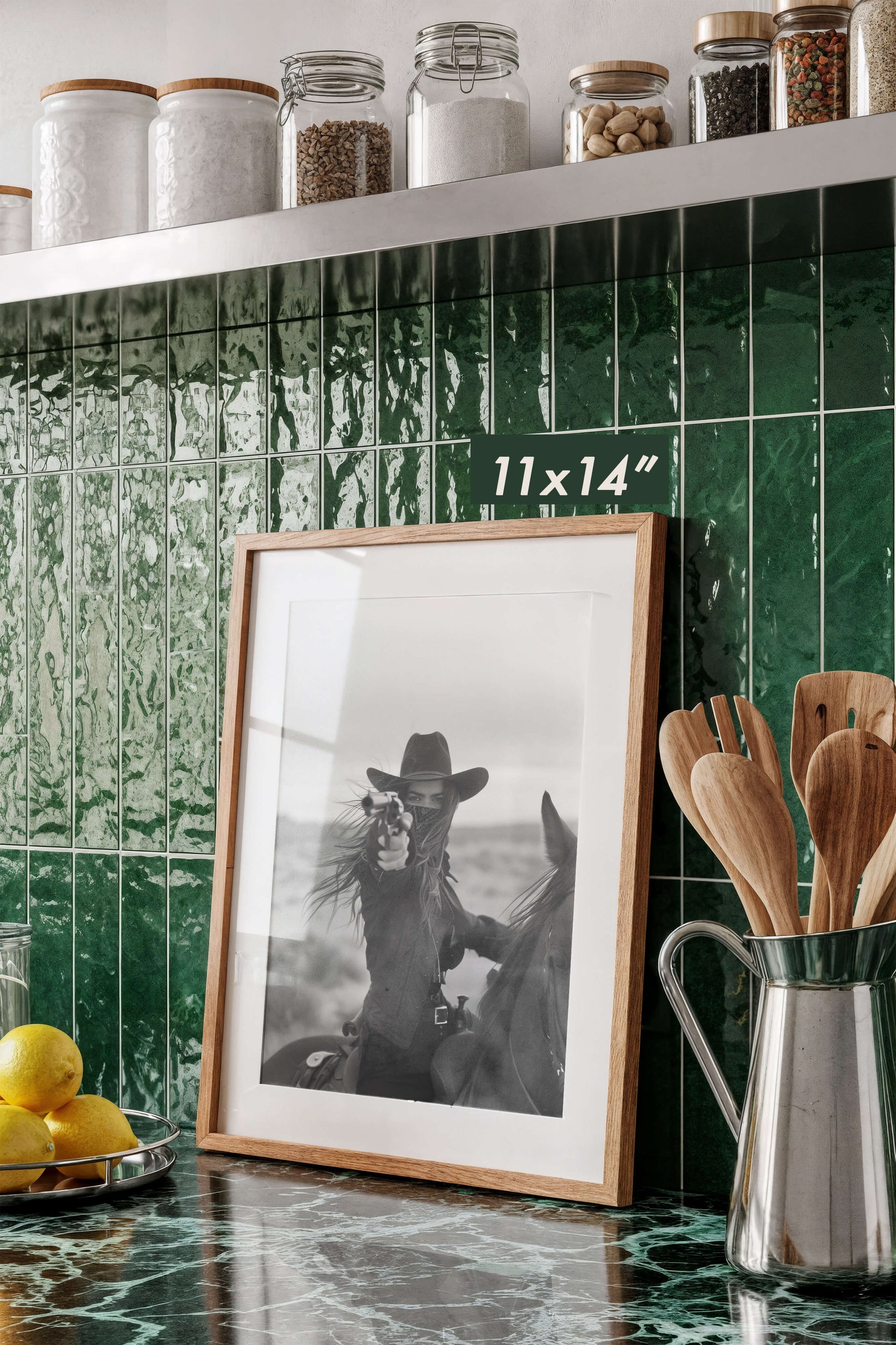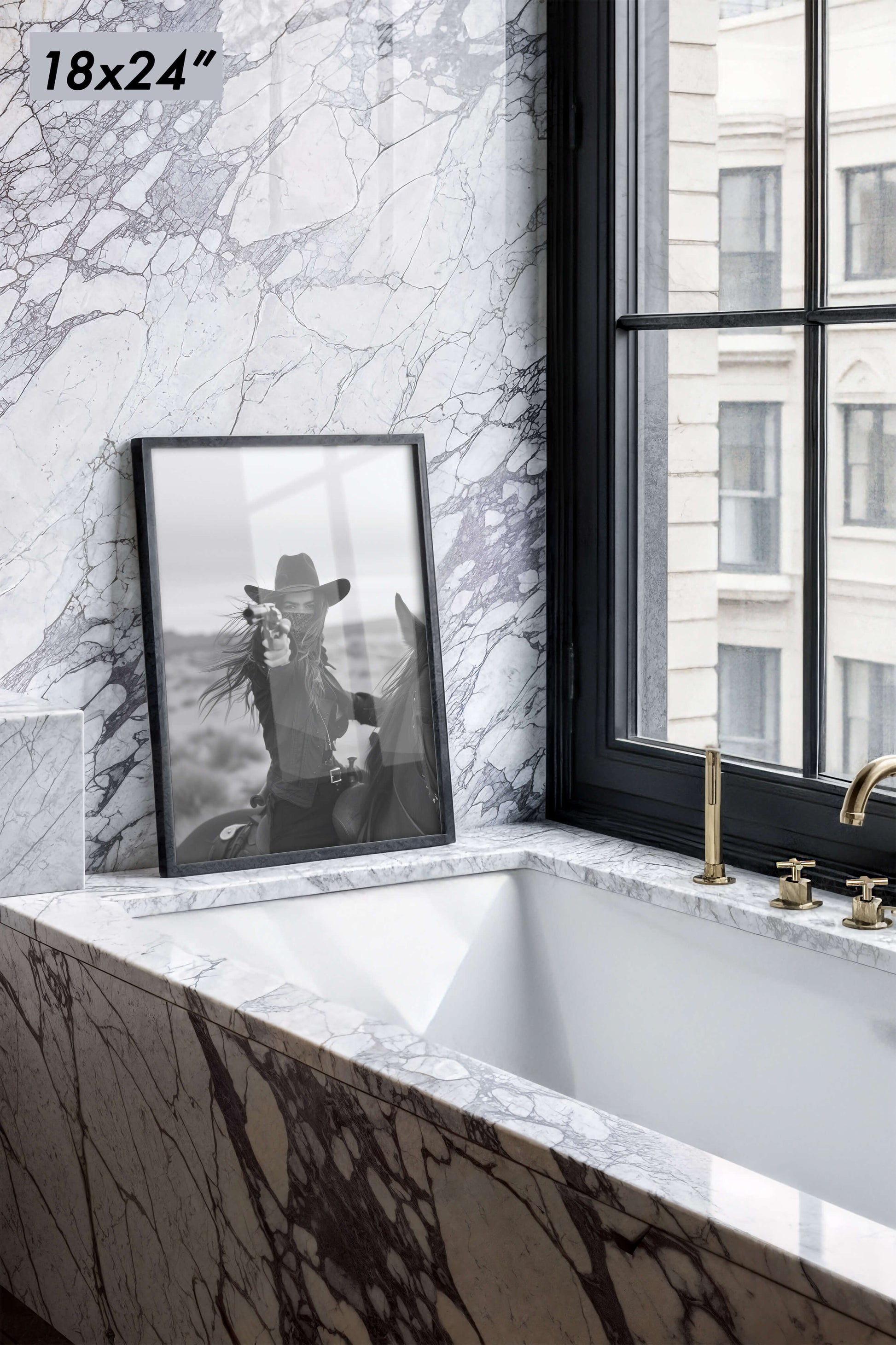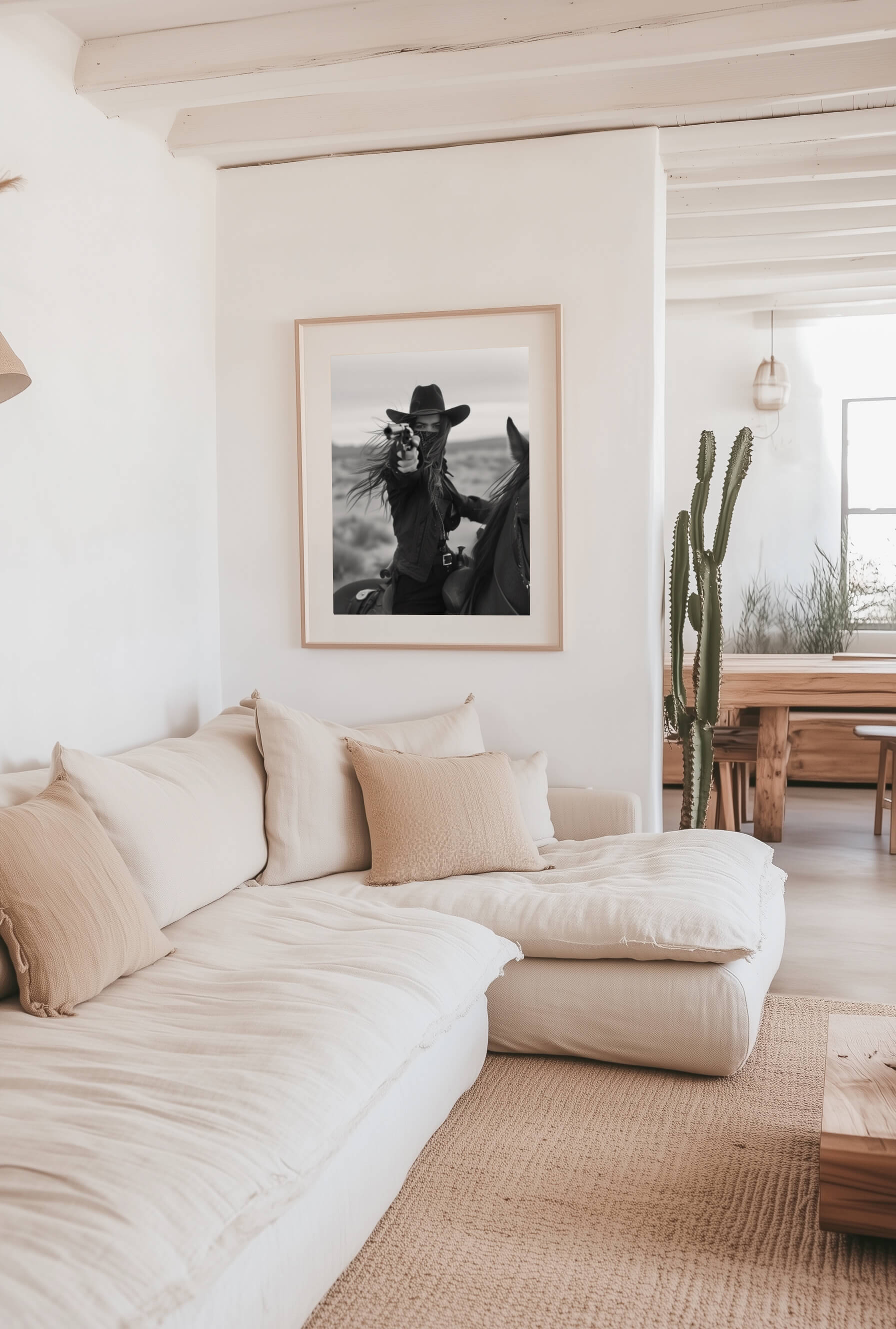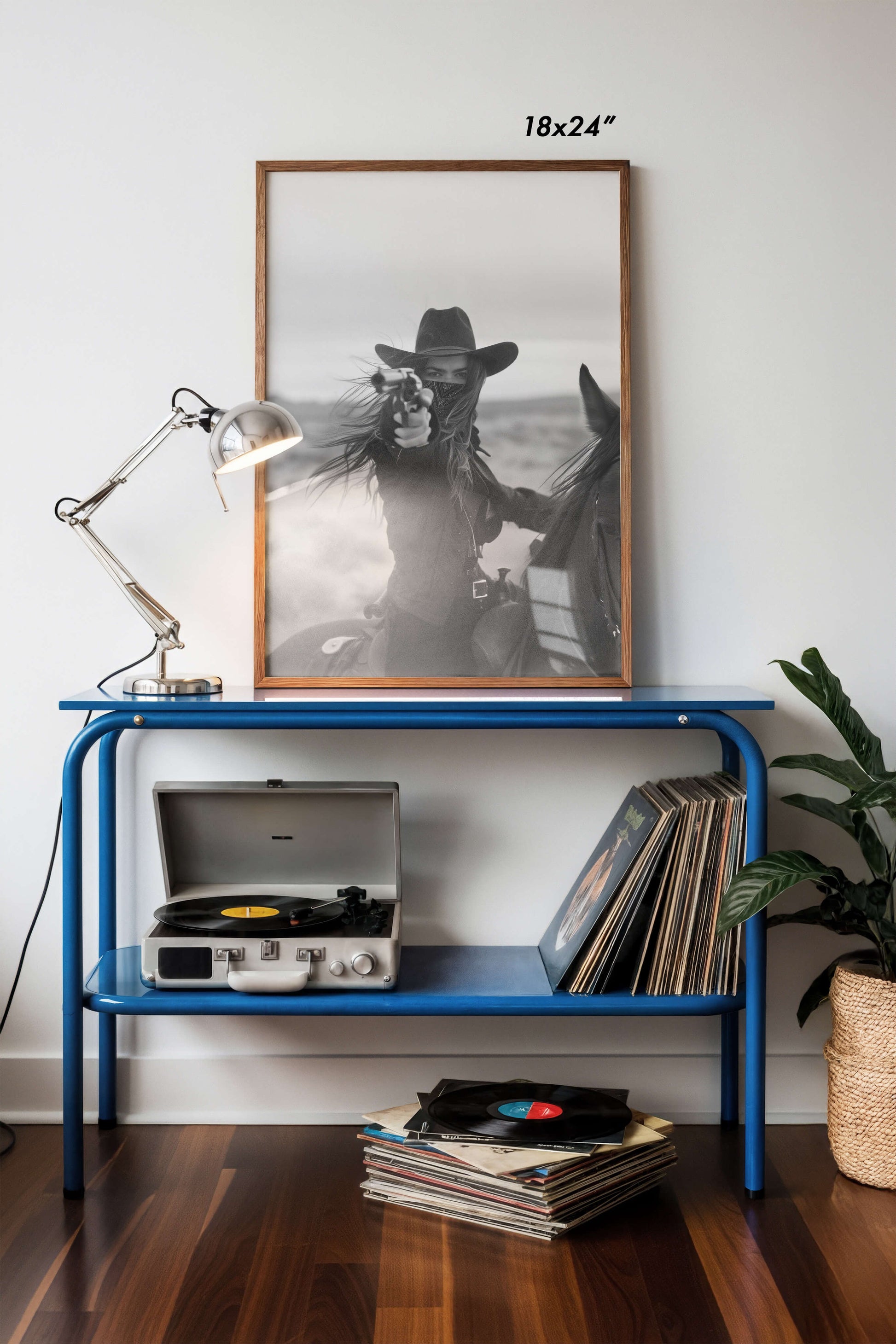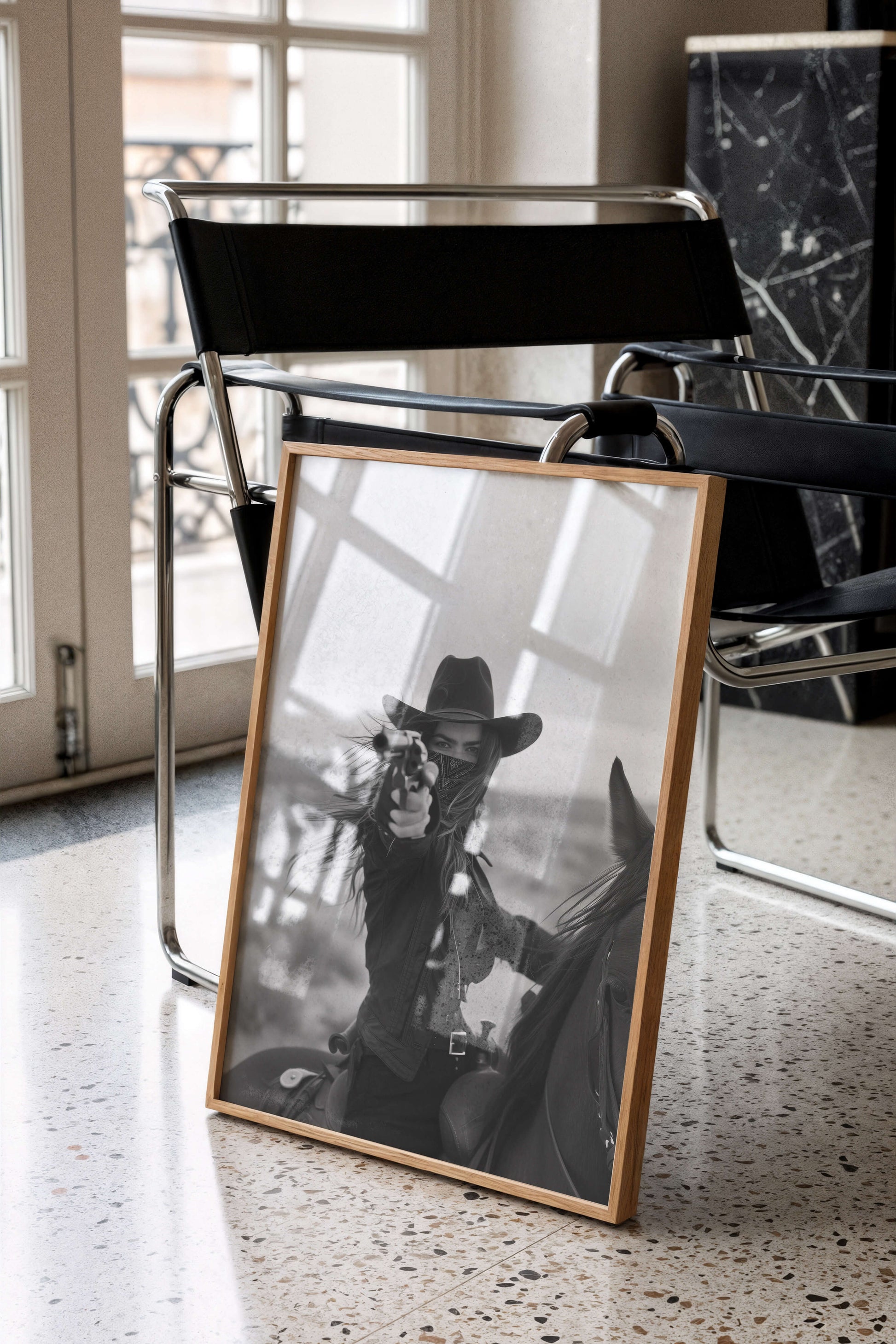 Capture the wild spirit of the Old West with this striking black and white photograph of a fearless rider on horseback, aiming her revolver against the backdrop of a desolate desert. This powerful image evokes a sense of adventure and raw determination, perfect for adding a bold statement to your living space, office, or gallery wall. Ideal for lovers of Western art and vintage photography, this print is available in various sizes and ready to frame. Bring a piece of the Wild West into your home with this captivating cowgirl art print.